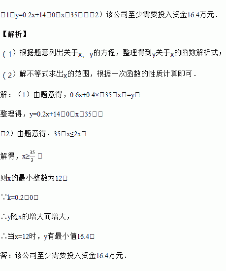 某公司计划购买A,B两种型号的电脑,已知购买一台A型电脑需0.6万元,购买一台B型电脑需0.4万元,该公司准备投入资金y万元,全部用于购进35台这两种型号的电脑,设购进A型电脑x台.