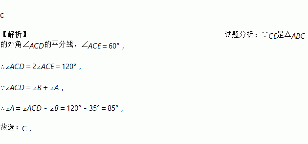如图,CE是△ABC的外角∠ACD的平分线,若∠B=35°,∠ACE=60°,则∠A=( )