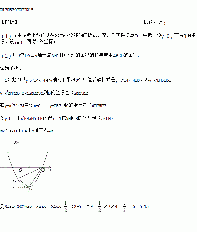 (1)(5,0);(2)15. 【解析】试题分析: (1)先由图象平移的规律求出抛物线的解析式,配方后可得顶点D的坐标,设y=0,可得B的坐标,设x=0,可得C的坐标; (2)过D作DA⊥y轴于点A,根据图形的面积的和与差求△BCD的面积. 试题解析: (1)抛物线y=x2﹣4x+4沿y轴向下平移9个单位后解析式是y=x2﹣4x+4﹣9,即y=x2﹣4x﹣5. ...