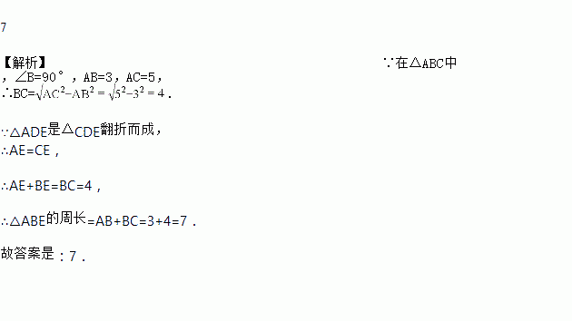 如图所示,在△ABC中,∠B=90°,AB=3,AC=5,将△ABC折叠,使点C与点A重合,折痕为DE,则△ABE的周长为_____.