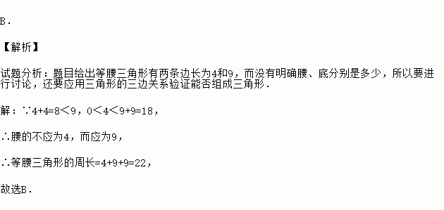 B. 【解析】 试题分析:题目给出等腰三角形有两条边长为4和9,而没有明确腰、底分别是多少,所以要进行讨论,还要应用三角形的三边关系验证能否组成三角形. 【解析】 ∵4+4=8<9,0<4<9+9=18, ∴腰的不应为4,而应为9, ∴等腰三角形的周长=4+9+9=22, 故选B.