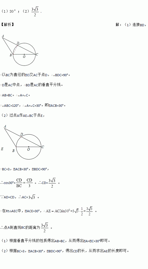 如图△ABC中,BC=3,以BC为直径的⊙O交AC于点D,若D是AC中点,∠ABC=120°.