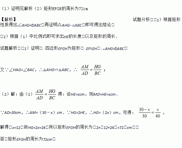 如图,△ABC是一张锐角三角形的硬纸片.AD是边BC上的高,BC=40cm,AD=30cm.从这张硬纸片剪下一个长HG是宽HE的2倍的矩形EFGH.使它的一边EF在BC上,顶点G,H分别在AC,AB上.AD与HG的交点为M.