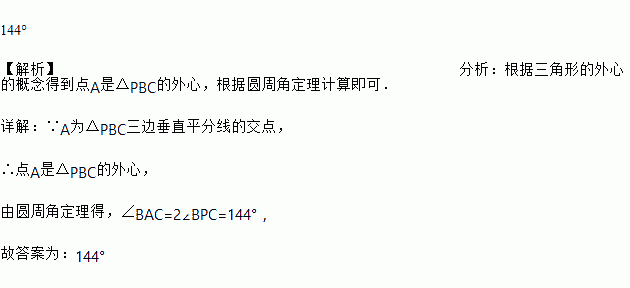 如图,点A为△PBC的三边垂直平分线的交点,且∠P=72°,则∠BAC=_____.