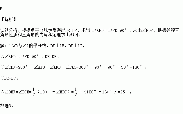 B 【解析】 试题分析:根据角平分线性质得出DE=DF,求出∠AAED=∠AFD=90°,求出∠EDF,根据等腰三角形性质和三角形的内角和定理求出即可. 【解析】 ∵AD为∠A的平分线,DE⊥AB,DF⊥AC, ∴∠AED=∠AFD=90°,DE=DF, ∵∠EDF=360°﹣∠AED﹣∠AFD﹣∠BAC=360°﹣90°﹣90°﹣50°=130°, ∵DE=...