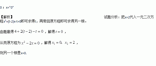 已知一元二次方程x2+(t-2)x-t=0有一个根是2,则t=_______,另一个根是______.