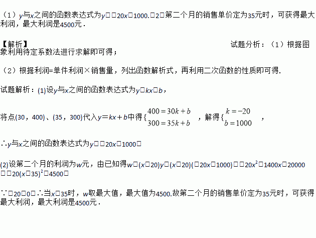 某商店购进一批进价为20元/件的日用商品,第一个月,按进价提高50%的价格出售,售出400件;第二个月,商店准备在不低于原售价的基础上进行加价销售,根据销售经验,提高销售单价会导致销售量的减少.销售量y(件)与销售单价x(元)的关系如图所示.