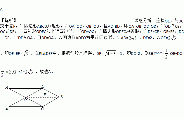 如图,矩形 ABCD 的对角线 AC 与 BD 相交于点 O,CE∥BD, DE∥AC , AD=2, DE=2,则四边形 OCED 的面积为( )