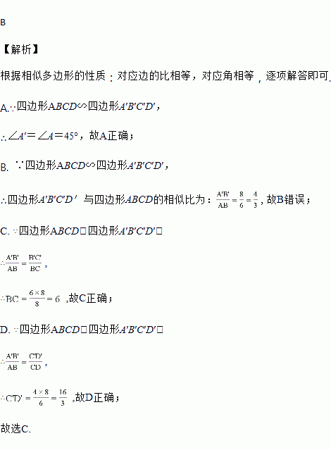 若四边形ABCD∽四边形A′B′C′D′,AB=6,A′B′=8,∠A=45°,B′C′=8,CD=4,则下列说法错误的是( )