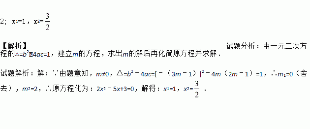 2; x1=1,x2= 【解析】试题分析:由一元二次方程的△=b2﹣4ac=1,建立m的方程,求出m的解后再化简原方程并求解. 试题解析:【解析】 ∵由题意知,m≠0,△=b2﹣4ac=[﹣(3m﹣1)]2﹣4m(2m﹣1)=1,∴m1=0(舍去),m2=2,∴原方程化为:2x2﹣5x+3=0,解得:x1=1,x2=.
