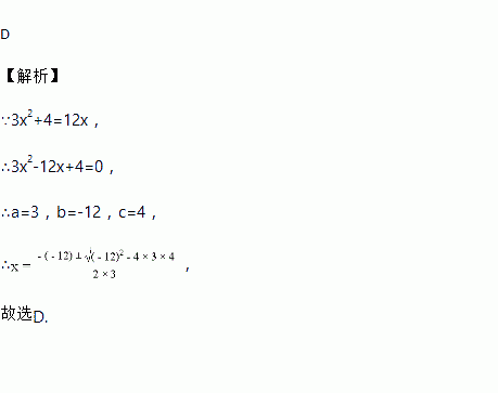用公式法解方程3x2+4=12x,下列代入公式正确的是( )