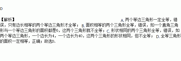 C. 形状相同的两个三角形全等 D. 全等三角形的面积一定相等