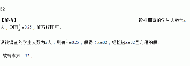 为了调查本班学生课外阅读情况,学习委员对学生喜爱的书籍进行分类统计,其中“古诗词类”的频数为8人,频率为0.25,则被调查的学生人数为________人.