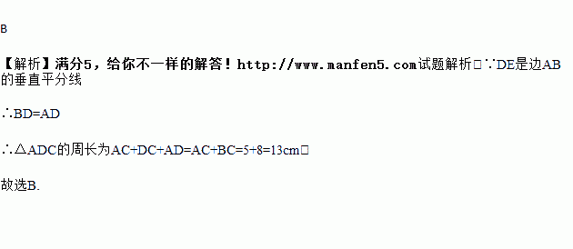 如图,在△ABC中,DE是边AB的垂直平分线,BC=8cm,AC=5cm,则△ADC的周长为( )