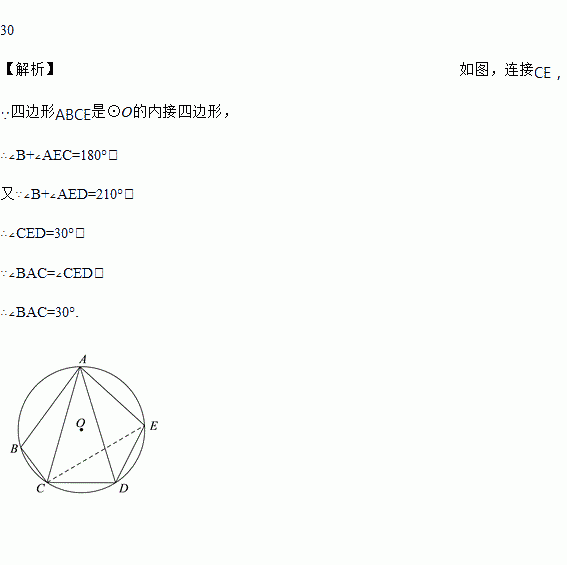如图,在⊙O的内接五边形ABCDE中,∠B+∠E=210°,则∠CAD=________°.