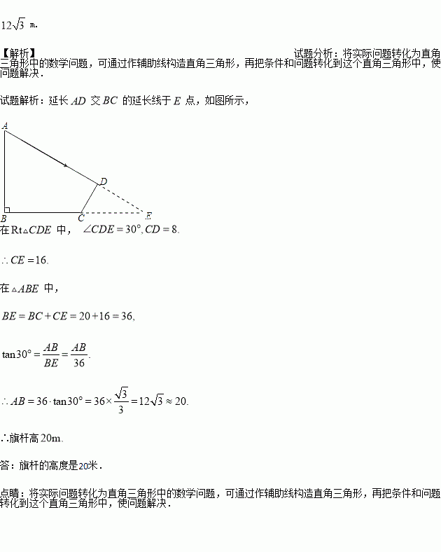 如图所示,小鹏准备测量学校旗杆的高度,他发现斜坡正对着太阳时,旗杆AB影子恰好落在水平地面BC和斜坡坡面CD上,测得旗杆在水平地面上的影长BC=20 m,在斜坡坡面上的影长CD=8 m,太阳光线AD与水平地面成30°角,且太阳光线AD与斜坡坡面CD互相垂直,请你帮小鹏求出旗杆AB的高度.(精确到1 m)