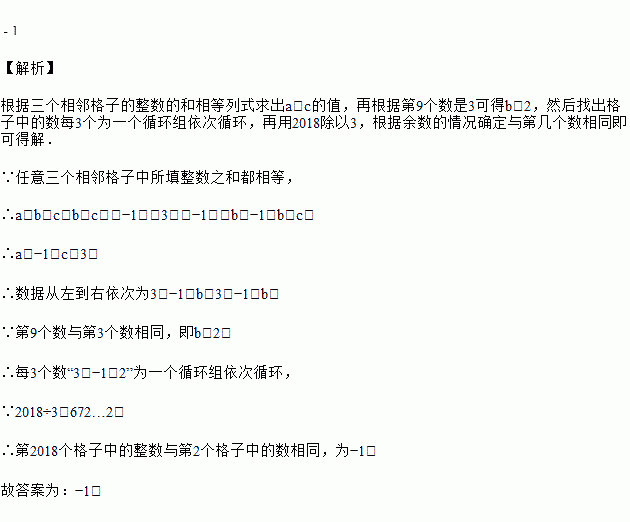 如下表,从左到右在每个小格子中都填入一个整数,使得其中任意三个相邻格子中所填整数之和都相等,则第个格子的数为_____.![]()