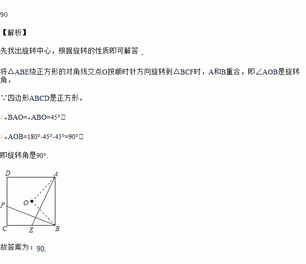 如图,E,F分别是正方形ABCD的边BC、CD上的点,BE=CF,连接AE,BF.将△ABE绕正方形的对角线交点O按顺时针方向旋转到△BCF,则旋转角是_______________°.