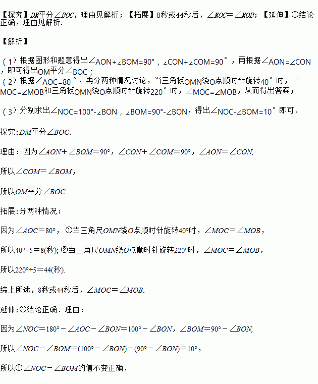 (拓展)若∠AOC=80°时,三角尺OMN绕O点顺时针旋转一周,每秒旋转5°,则多少秒后,∠MOC=∠MOB?
