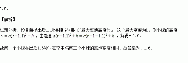 竖直上抛的小球离地高度是它运动时间的二次函数,小军相隔1秒依次竖直向上抛出两个小球,假设两个小球离手时离地高度相同,在各自抛出后1.1秒时到达相同的最大离地高度,第一个小球抛出后t秒时在空中与第二个小球的离地高度相同,则t= .