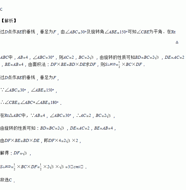如图,将含30°角的直角三角尺ABC绕点B顺时针旋转150°后得到△EBD,连接CD.若AB=4cm.则△BCD的面积为( )
