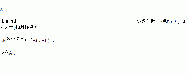 A 【解析】试题解析:∵点P(3,-4)关于y轴对称点P′, ∴P′的坐标是:(-3,-4). 故选A.