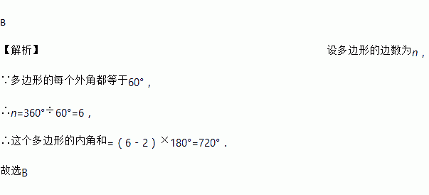 B 【解析】设多边形的边数为n, ∵多边形的每个外角都等于60°, ∴n=360°÷60°=6, ∴这个多边形的内角和=(6﹣2)×180°=720°. 故选B