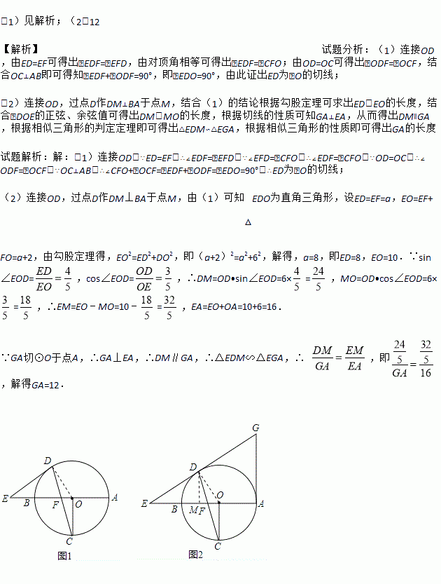 (1)见解析;(2)12 【解析】试题分析:(1)连接OD,由ED=EF可得出∠EDF=∠EFD,由对顶角相等可得出∠EDF=∠CFO;由OD=OC可得出∠ODF=∠OCF,结合OC⊥AB即可得知∠EDF+∠ODF=90°,即∠EDO=90°,由此证出ED为⊙O的切线; (2)连接OD,过点D作DM⊥BA于点M,结合(1)的结论根据勾股定理可求出ED、EO的长度,结合∠DOE的正弦、余...