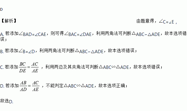 A. ÈôÌí¼Ó¡ÏBAD=¡ÏCAE£¬Ôò¿ÉµÃ¡ÏBAC=¡ÏDAE£¬ÀûÓÃÁ½½Ç·¨¿ÉÅжϡ÷ABC¡×¡÷ADE£¬¹Ê±¾Ñ¡Ïî´íÎó£»