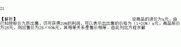 某品牌的商品按标价打九折出售仍可获得20%的利润,若该商品标价为28元,则进价为 元。