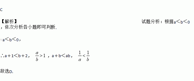 若a<b<0,有下列不等式:①a+1<b+2;② >1;③a+b<ab;④<.其中正确的有( )