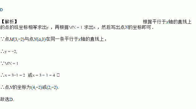 若点M(3,-2)与点N(x、y)在同一条平行于x轴的直线上,且MN=1,则N点的坐标为( )