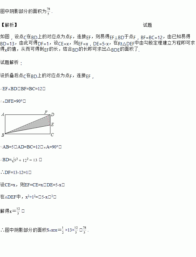 如图,在一张长方形ABCD纸张中,一边BC折叠后落在对角线BD上,点E为折痕与边CD的交点,若AB=5,BC=12,求图中阴影部分的面积.