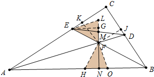 解答 证明:在AB上取两点H、O,使AE=AH,BO=BD,连接FH、FO,延长FM至L,使LM=FM,连接EL,过E作EG⊥MN,交NM的延长线于点G,作FK⊥AC于K,FJ⊥BC于J.得△AEF≌△AHF,则∠AFH=∠AFE=45°,