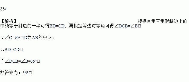 如图,在△ABC中,∠C=90?,∠B=36?,D为AB的中点,则∠DCB =________