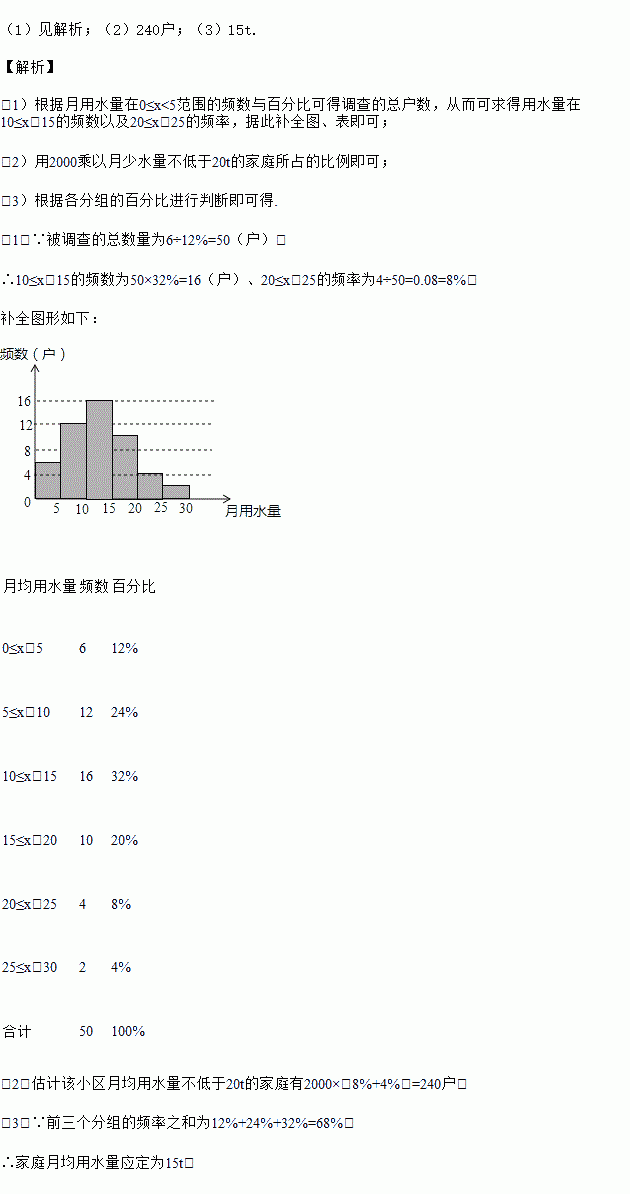 Ä³ÇøÔÚʵʩ¾ÓÃñÓÃË®¹ÜÀíǰ£¬Ëæ»úµ÷²éÁ˲¿·Ö¼ÒÍ¥£¨µ¥Î»£º»§£©È¥ÄêµÄÔ¾ùÓÃË®Á¿£¨µ¥Î»£ºt£©£¬²¢½«µ÷²éÊý¾Ý½øÐÐÕûÀí£¬»æÖƳöÈçϲ»ÍêÕûµÄͳ¼ÆÍ¼±í£º