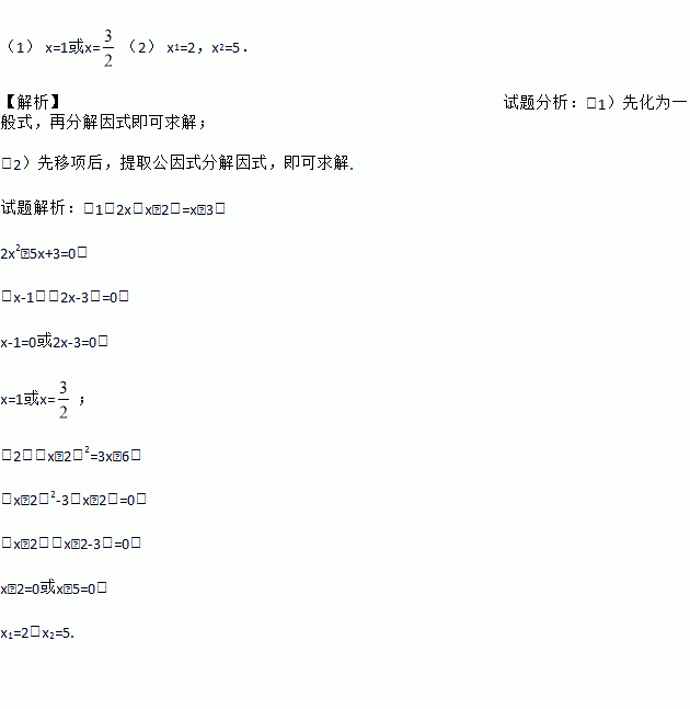 (1) x=1或x=(2) x1=2,x2=5. 【解析】试题分析:(1)先化为一般式,再分解因式即可求解; (2)先移项后,提取公因式分解因式,即可求解. 试题解析:(1)2x(x﹣2)=x﹣3, 2x2﹣5x+3=0, (x-1)(2x-3)=0, x-1=0或2x-3=0, x=1或x=; (2)(x﹣2)2=3x﹣6, (x﹣2)2-3...
