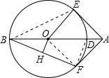 分析:(1)连接OF,BE,DF,由BD为圆O的直径,得到弧BED与弧BFD都为半圆,且弧BE=弧BF,可得出弧ED=弧FD,利用等弧所对的圆心角相等得到一对角相等,再加上OE=OF,OA为公共边,利用SAS可得出三角形AEO与三角形AFO全等,由全等三角形的对应角相等得到一对角相等,又AE为圆O的切线,利用切线的性质得到AE垂直于OE,可得出AF垂直于OF,进而确定出AF为圆O的切线;