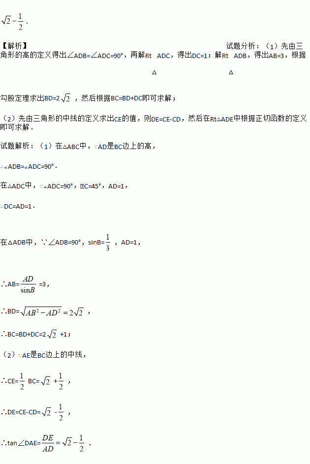 如图,在△ABC中,AD是BC边上的高,AE是BC边上的中线,∠C=45°,sin B=,AD=1.