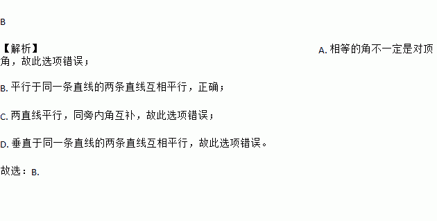 A. 相等的角是对顶角 B. 平行于同一条直线的两条直线互相平行