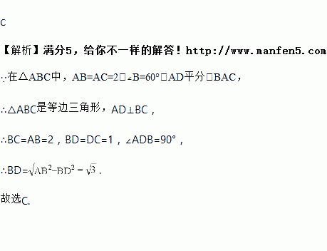 如图,在△ABC中,AB=AC=2,∠B=60°,AD平分∠BAC,则AD等于( )