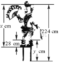 如图,在东北大秧歌的踩高跷表演中,已知演员身高是高跷长度的2倍,高跷与腿重合部分的长度为28 cm,演员踩在高跷上时,头顶距离地面的高度为224 cm.设演员身高为x cm,高跷的长度为y cm,求x,y的值.