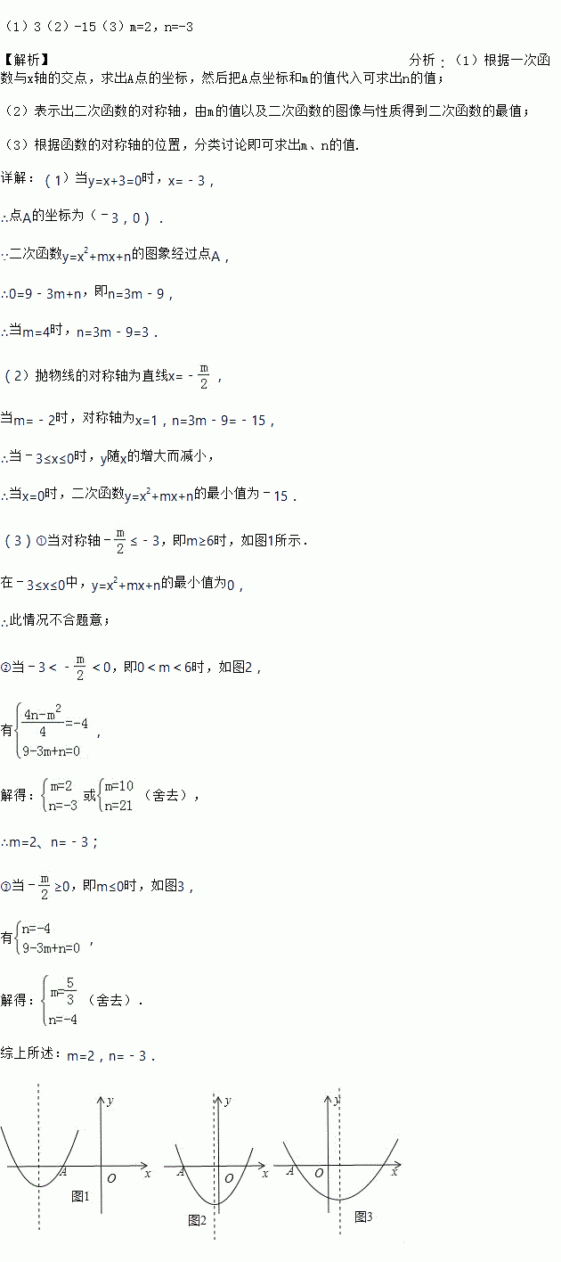 在平面直角坐标系中,一次函数y=x+3的图象与x轴交于点A,二次函数y=x2+mx+n的图象经过点A.