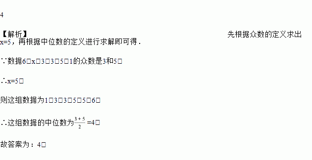 已知一组数据6,x,3,3,5,1的众数是3和5,则这组数据的中位数是_____.