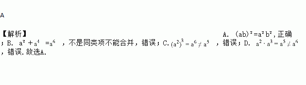 A. (ab)2=a2b2 B. a2+a4=a6 C. (a2)3=a5 D. a2•a3=a6