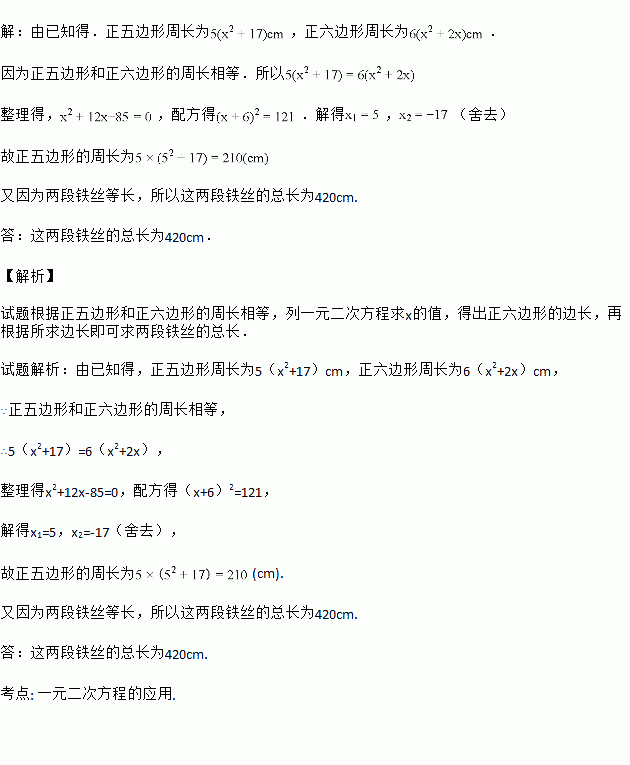 如图,用两段等长的铁丝恰好可以分别围成一个正五边形和一个正六边形,其中正五边形的边长为(