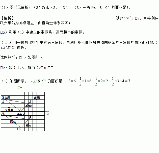 (3)请将体育场、宾馆和火车站看作三点,用线段连接起来,得到三角形ABC,然后将此三角形向下平移4个单位,再画出平移后的三角形A′B′C′,并计算三角形A′B′C′的面积﹒
