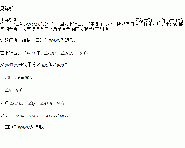 如图,□ABCD中,AQ、BN、CN、DQ分别是∠DAB、∠ABC、∠BCD、∠CDA的平分线,AQ与BN交于P,CN与DQ交于M,在不添加其它条件的情况下,试写出一个由上述条件推出的结论,并给出证明过程(要求:推理过程中要用到“平行四边形”和“角平分线”这两个条件).
