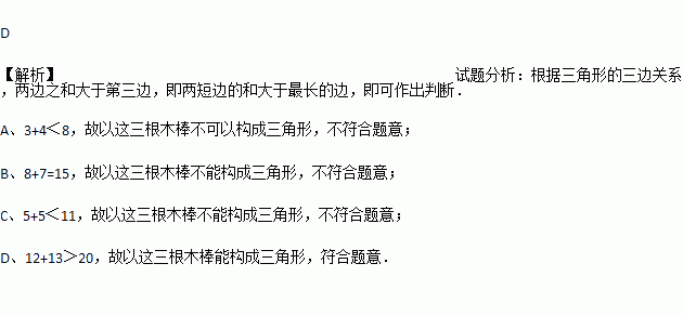 下列每组数分别是三根木棒的长度,能用它们摆成三角形的是( )