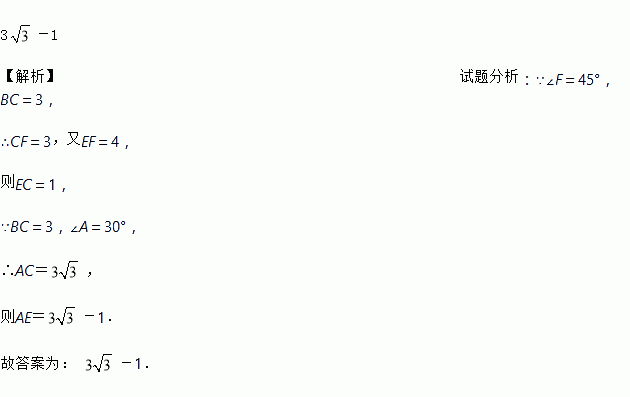 已知一副直角三角板如图放置,其中BC=3,EF=4,把30°的三角板向右平移,使顶点B落在45°的三角板的斜边DF上,则AE= _________.